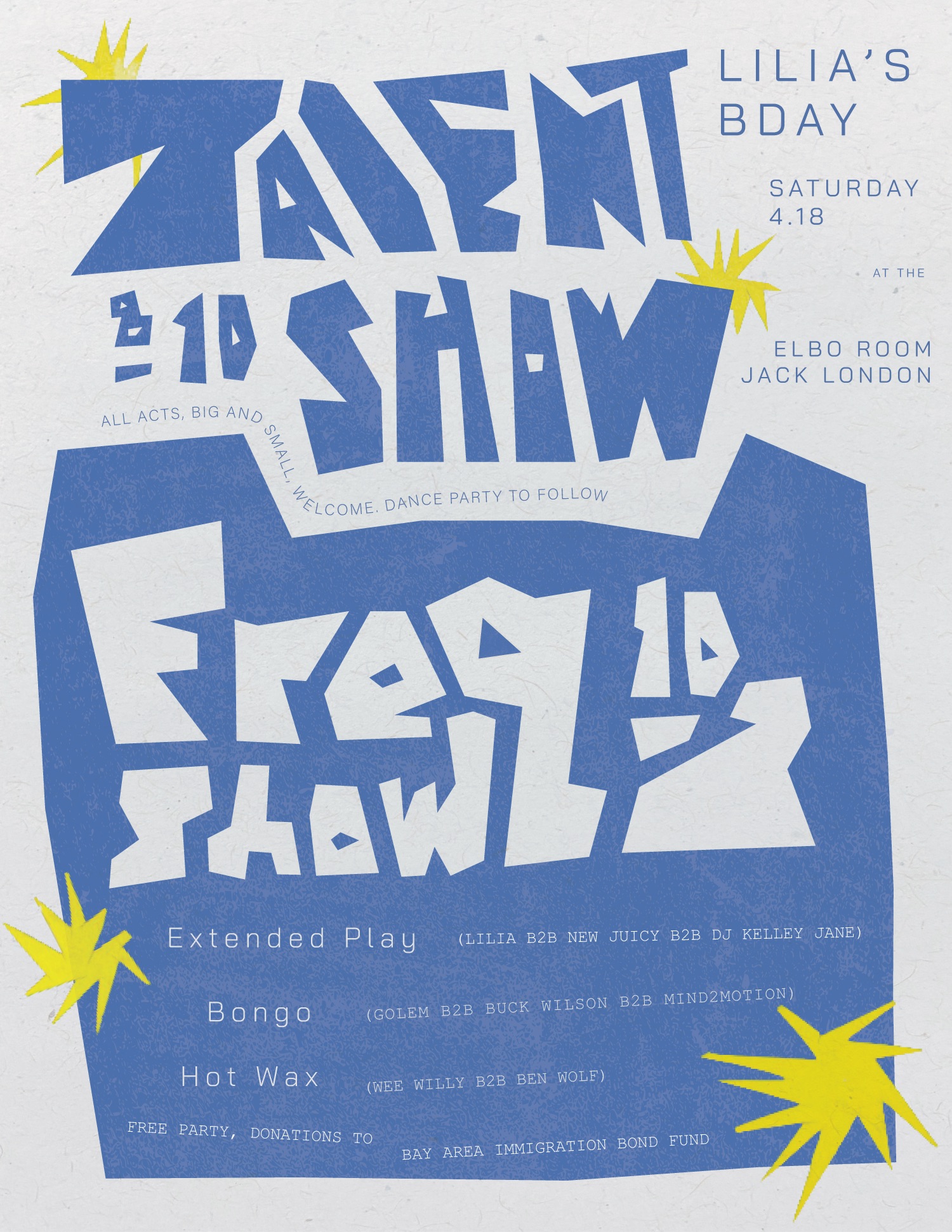 The party is free for all, but we suggest a $10 donation to the Bay Area Immigration Bond Fund (now a part of Norcal Resist). The Bond Fund supports the rights of detained individuals by raising money to help them post bond, secure their release, and support their right to remain in their homes. You may venmo @lilia-chang with your donation.
